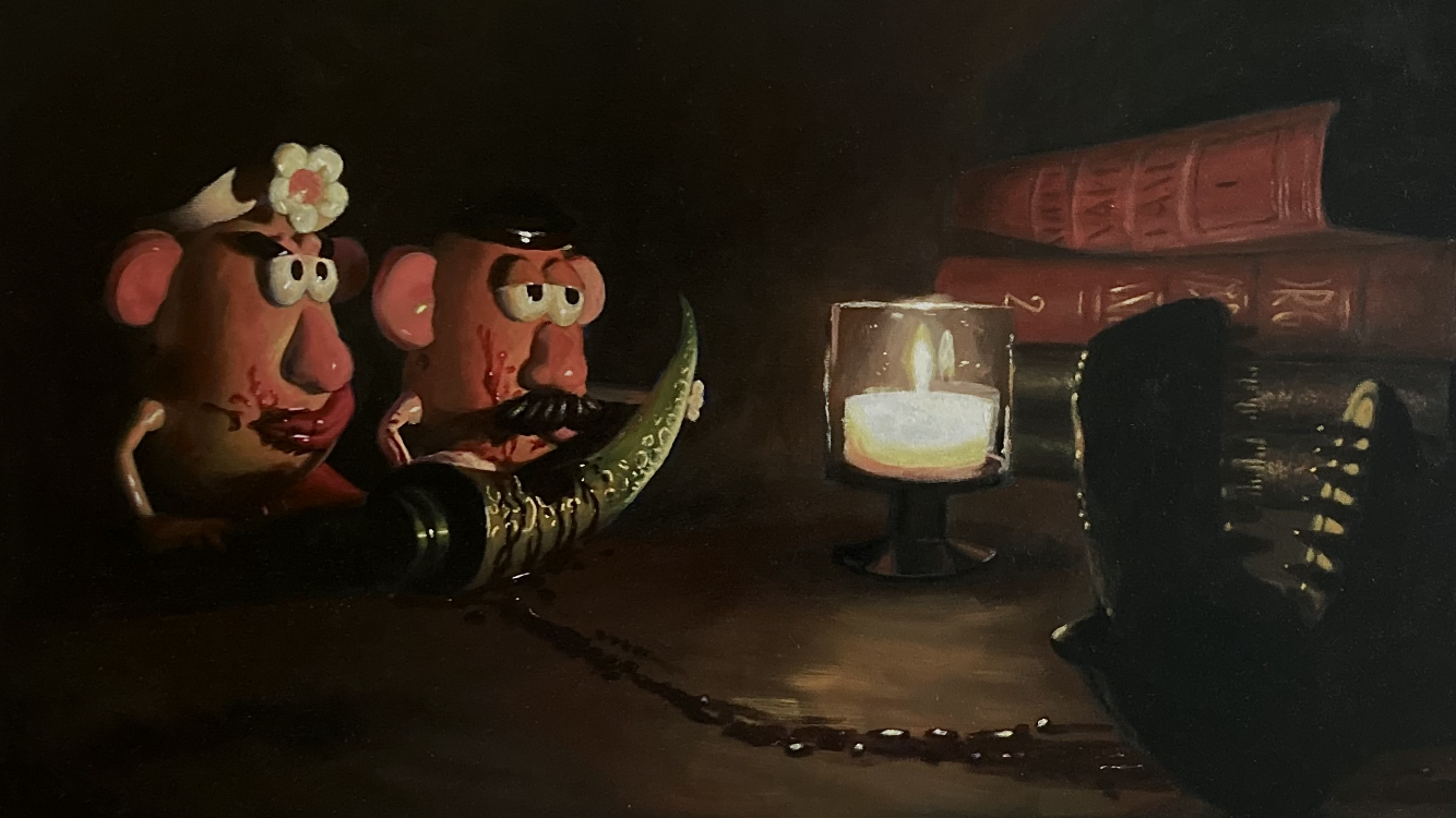 "Tail of Treachery" is a captivating, Baroque-inspired masterpiece that delves into the themes of deadly consumption and duplicity. In this sinister painting, we are confronted with the harrowing reality of how we often consume the trust and loyalty of our closest companions, piece by piece, all for our own selfish gain. The strong contrast between the once-happy memories of our childhood and the treacherous path we sometimes choose to follow is powerfully portrayed. This artwork serves as a reminder of the perils of betrayal and the profound impact it can have on our lives and relationships.
